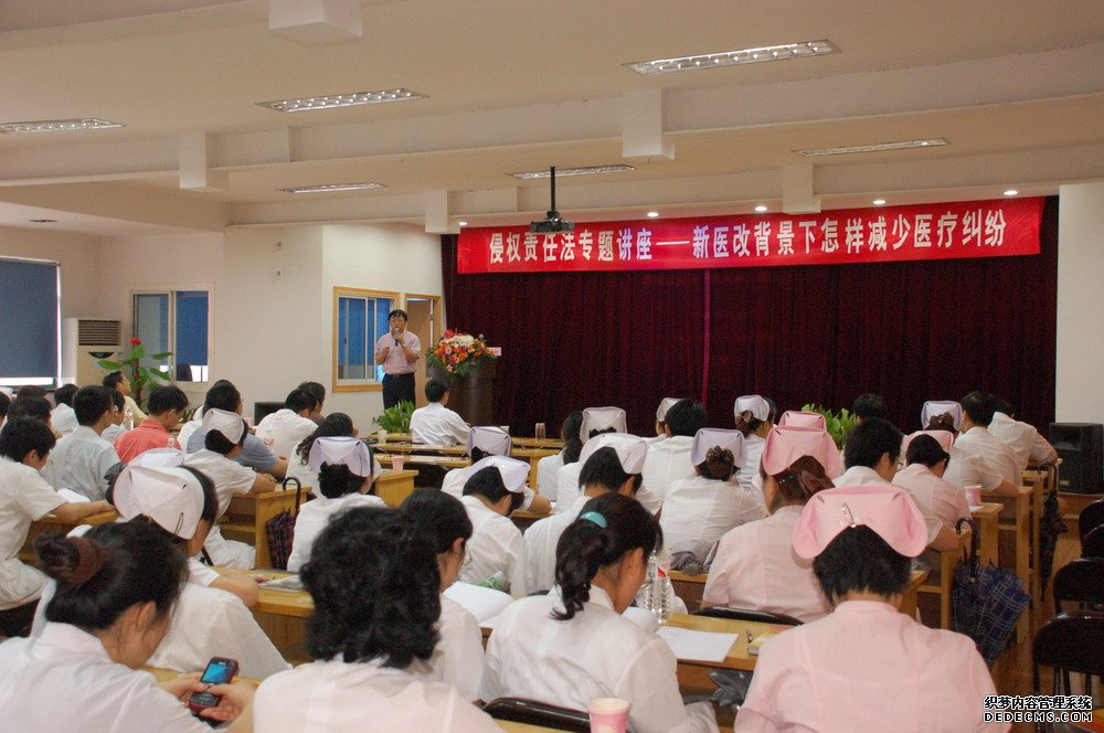 我院在学术大会堂举办了一场“侵权责任法专题讲座——新医改新背景下怎样减少医疗纠纷”的专题讲座。全院科主任、护士长、各职能科室负责人及部分医护人员近150人到现场听课。